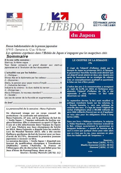 Véritable instrument de veille économique - L'Hebdo du Japon est la seule revue de presse francophone hebdomadaire traitant de l'actualité japonaise, envoyée par e-mail.