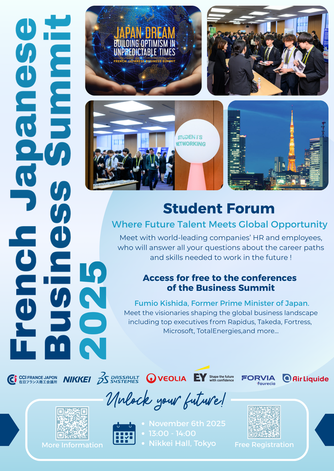 With 7 company booths on site, students were able to engage directly with professionals, discover internship and job prospects, and gain insights into the French-Japanese business environment. The Forum aimed to inspire future leaders and foster strong academic and professional ties between both countries.
