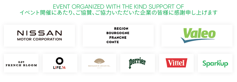 Thank to all sponsors for their generous support: Nissan, Veolia, Dassault Systèmes, Crédit Agricole, Toyota Tsusho, Forvia Faurecia, EY, Air Liquide, Capgemini, Horiba, Mitsui Fudosan, Natixis, Société Générale, the Bourgogne-Franche-Comté Region, Valeo, French Bloom, Life 14, Mandarin Oriental, Perrier, Vittel, Sparkup,