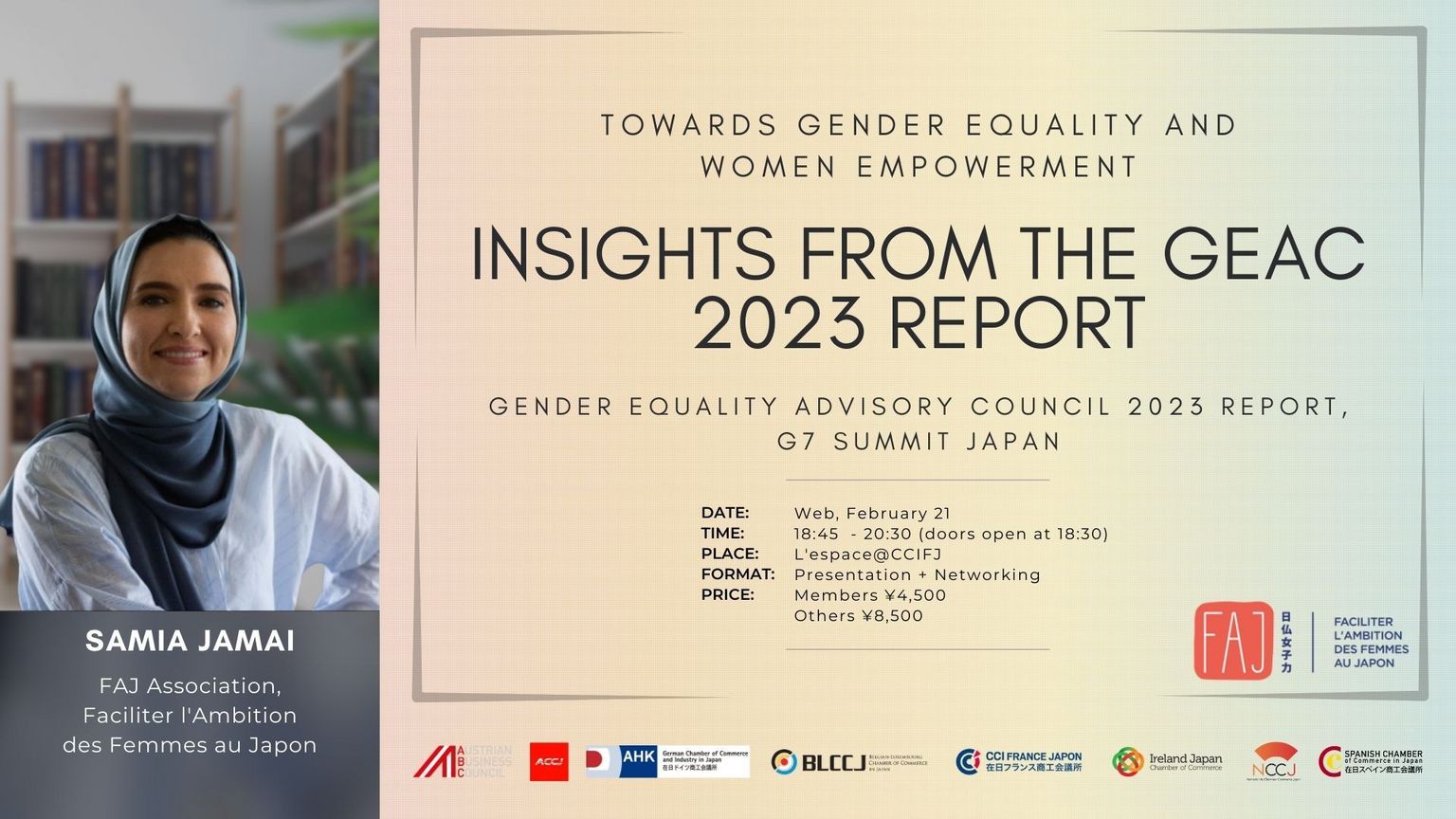 The Gender Equality Advisory Council (GEAC) released its Recommendations in December 2023 during the G7 Hiroshima Summit Follow-up at the United Nations University Headquarters. The report outlines concrete measures for gender mainstreaming in 'economic empowerment,' 'education,' 'peacebuilding,' and 'data,' sharing best practices and actionable solutions. During this seminar, we will explore key insights, focusing on the recommendations to address gender gaps in these areas. Our objective is to be updated on the latest frameworks and recommendations, fostering women’s leadership and engagement. <Time Schedule> 18:30 Opening Doors 18:45 Presentation + Q&A 19:30 Networking 20:30 End of the event
