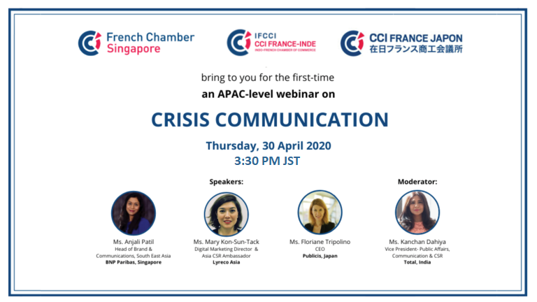 The French Chamber of Commerce & Industry in Japan in collaboration with the Indo-French Chamber of Commerce & Industry and the French Chamber of Commerce in Singapore are jointly organising an APAC- Level Webinar on Crisis Communication or how to communicate during a pandemic situation.