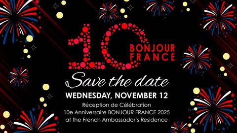 À l’occasion du 10ᵉ anniversaire de BONJOUR FRANCE, et sous le parrainage de l'Ambassade de France, BONJOUR FRANCE a le plaisir de vous inviter à la Réception de Célébration, à la Résidence de l’Ambassadeur de France.