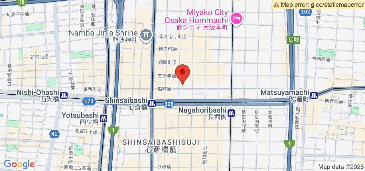 ? Environ 3 minutes à pied de la station Shinsaibashi (ligne Nagahori Tsurumi-ryokuchi et ligne Midosuji du métro)