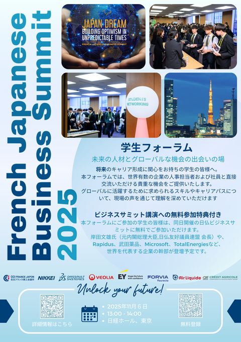トップレベルの著名なスピーカーを招集し、年間を通して開催しているビジネスリーダーズフォーラムは、今年で8回目を迎えます。全てのウェビナーやカンファレンスを通して「未来へ向けた日本の道」を構築することができるでしょう。年間の集大成である「日仏ビジネスサミット」は、2025年11月6日、東京・日経ホールにて開催する予定です。