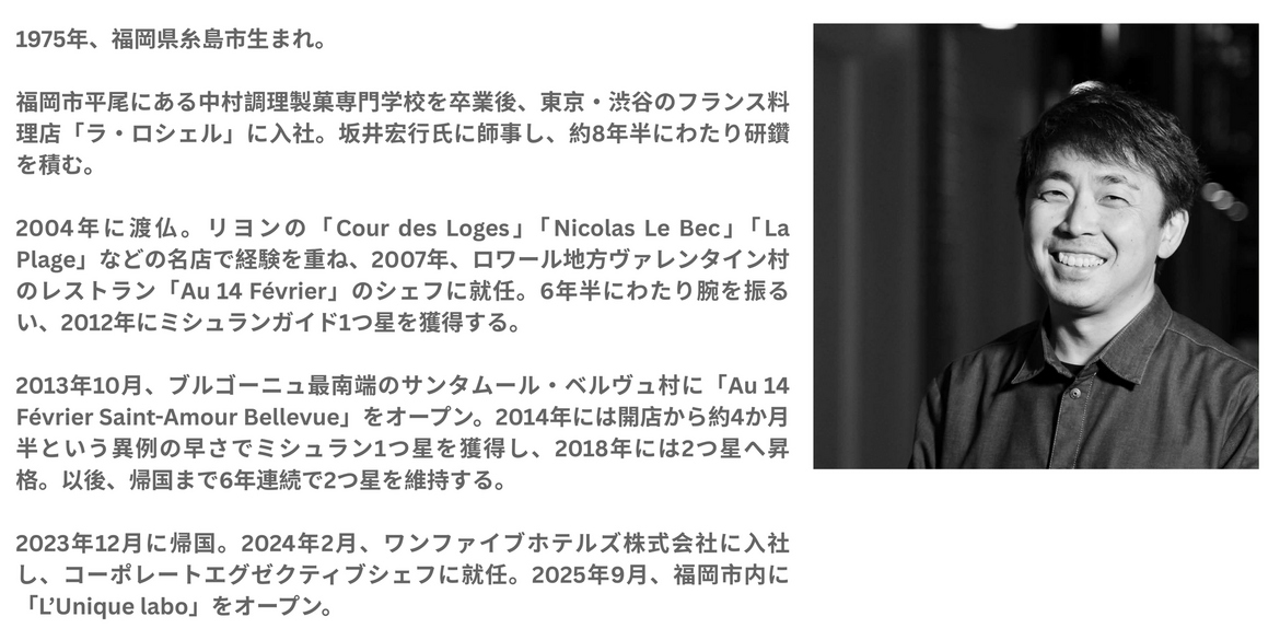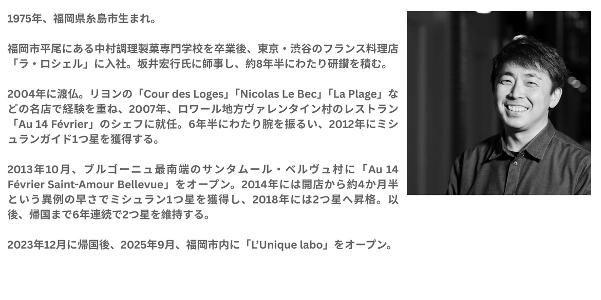 今回は、福岡県出身でレストラン「L’Unique labo」のシェフを務める浜野雅文氏が特別ディナーをご用意します。浜野氏はフランスで20年近く経験を積んだ後、レストラン「Au 14 Février Saint-Amour Bellevue」のシェフを務め、6年連続でミシュラン2つ星を獲得。2023年に帰国した後は、故郷福岡でシェフとして活動しています。