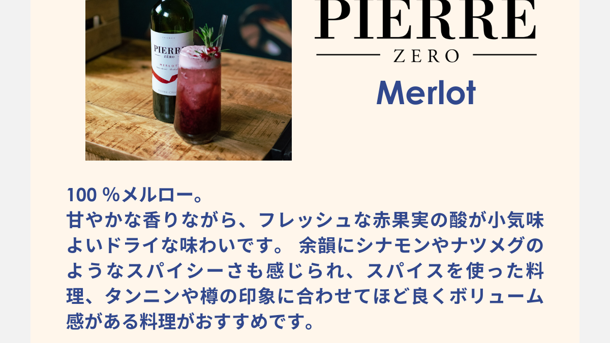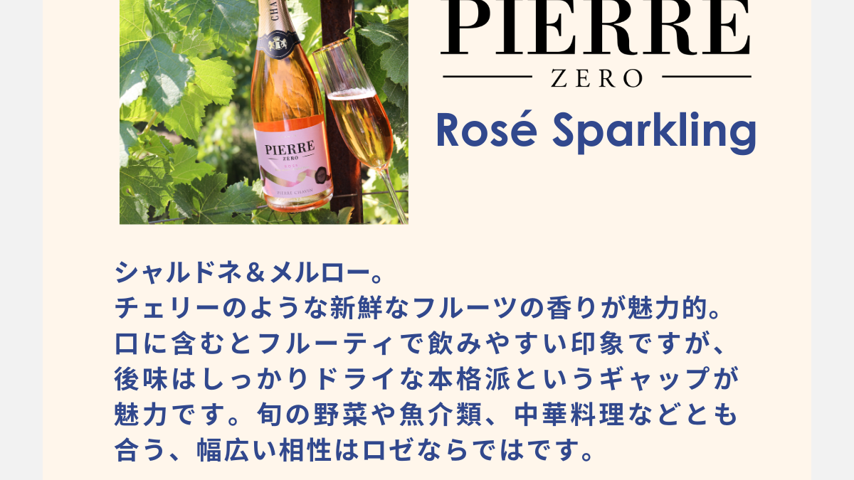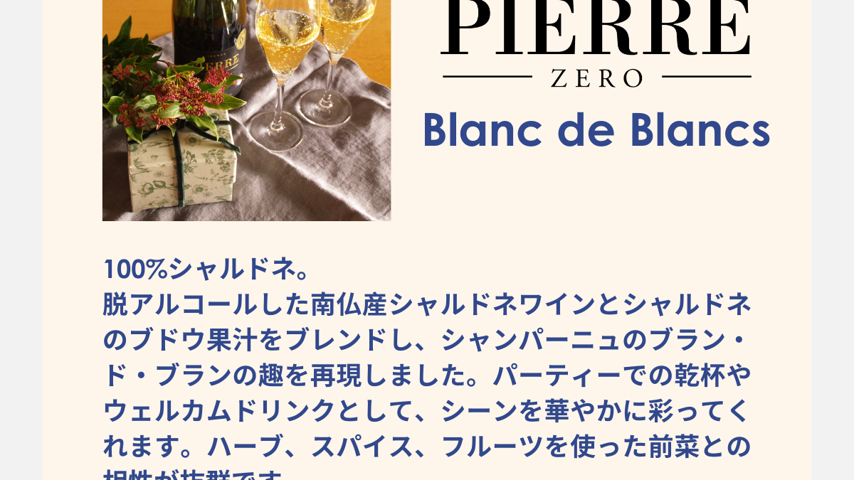 「ピエール・ゼロ」はアルコールゼロワイン専門のブランドです。高級ワインの味わいと風格をそのままにアルコールを取り除くことに成功し、普段からお酒を飲む方も、飲まない方もシーンを選ばず皆んなで乾杯できる新しいワインを提供しています。