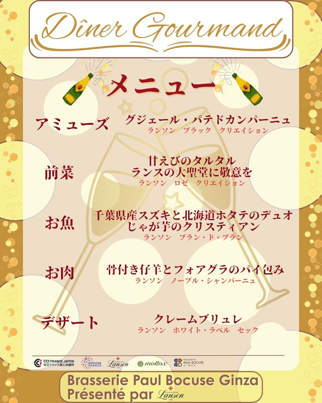 ボンジュール・フランスは、ブラッスリー ポール・ボキューズとシャンパーニュ・メゾン「ランソン」と共に、特別なグルメ・ディナーをお届けします。