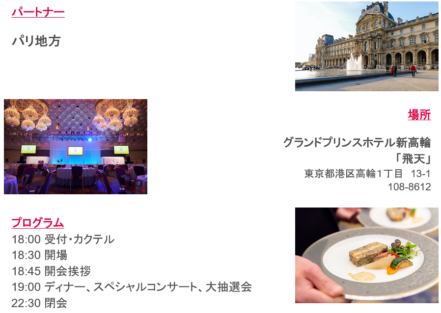 在日フランス商工会議所で年間最大のイベントであるガラ・パーティー東京が、今年は11月9日(木)18時より、グランドプリンスホテル新高輪にて開催されます。