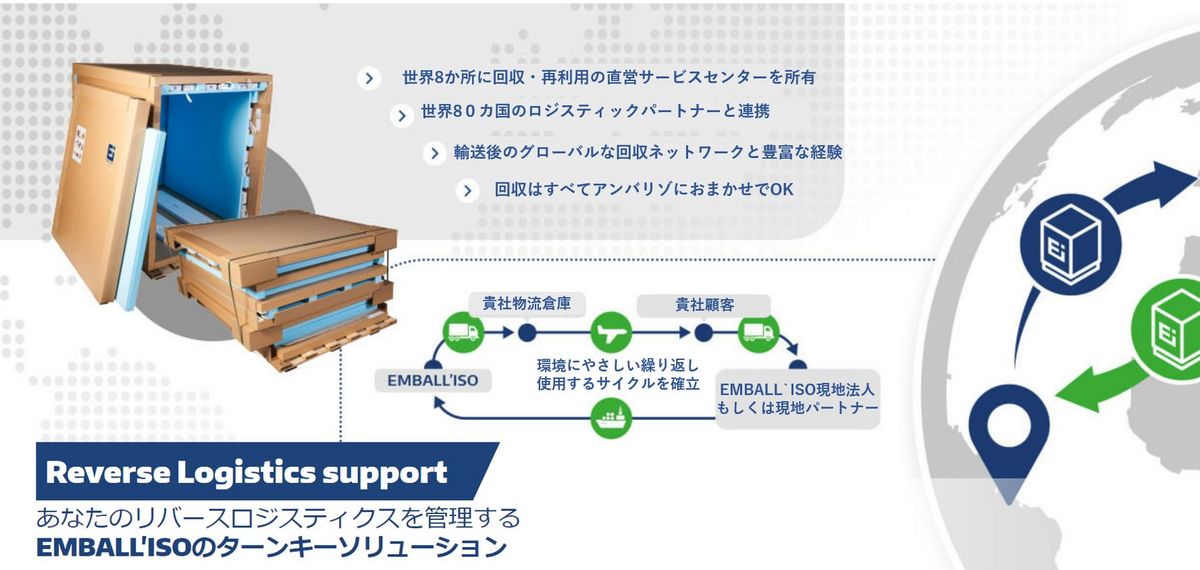 アンバリゾでは医薬品輸送用途 をメインターゲットとし、お客様の多様なニーズに細やかに応えるためにも長距離・長時間保冷・大容量の国際輸送にも耐えうる当社の看板商品である「パレットシッパー」から中距離用の「 VYPE (ヴァイプ)」、「 ISOGO (イソゴー)」そしてラストワンマイルお届け用の保冷バッグまで幅広いラインナップを取り揃えています。またお客様の利便性向上のためにご希望の温度に調整された保冷剤入り梱包箱が必要な日時に配達されあとは内容物を詰めるだけの Reay to Use サービスや梱包箱・保冷剤を輸送後に回収・洗浄・修理するリユーズサー ビスを提供。またリユーズのための回収には EMBALL`ISO のグローバルネットワークにより全世界 80 か国以上の目的地に対応し、アンバリゾはリバースロジスティクスサービスの先駆者として昨今の環境問題 の課題であるCO2 削減に大きく貢献しています。回収・再利用することで製品のライフサイクルにおいて排出されるCO2 は 9 割以上削減できます。今後は日本においても大容量輸送から小口配送までをカバーするアンバリゾの幅広い商品ラインナップを Ready To Use サービスとともに提供し、さらには梱包箱のリサイクルが できるサービスセンターを設立しアンバリゾのこれまでの長年のノウハウをいかしたリユーズサービスを始める予定。