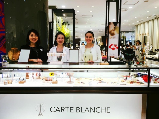 アレキサンドラ・澁江-ボダン氏は、日本市場にフランスの新しいブランドを紹介したいと望んでいた。「目標は、フランスの創作と日本のセンスを組み合わせ、キャルトブランシュを両文化の架け橋にすることです」と、ボダン氏は話す。「当社のアクセサリーはフランス人のクリエイターが専属で制作したもので、パーツは一点ものか、ほとんど流通していないものを採用しています」。モードやアクセサリーといった「ありふれた」市場で、キャルトブランシュは他と差別化し、その他大勢から抜け出す必要があった。「当社はオリジナルブランドの展開を目指しています。商品を販売するときは、私自身が出向いて、商品の説明をし、デザイナーやブランド、その精神について話します。単にファッションの話をするだけではありません」。キャルトブランシュが販売しているのはラグジュアリーなアクセサリーだ。「アクセサリーは簡単に身に着けられ、構成するテクスチャー、色、素材が独創的でなければなりません。そして唯一無二のものでなければなりません」。アクセサリーはまた、日本の服装スタイルにも合わせられるものでなければならない。「日本ではファッションは非常にシンプルなものです。当社のアクセサリーも、この傾向に適応するよう、シンプルかつエレガントで洗練されたものを追求しています。しかし、身に着けた人の身なりに華やかさを添えるフランス流のオリジナリティタッチも必要です」。