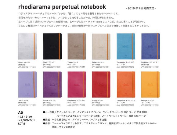 書くことで思考を整理するノート「ロディアラマ パーペチュアルノートブック」のカレンダーは、日付をもたないので、好きな時からお使いいただけます。週間や年間のスケジュールを俯瞰して把握、年号を入れるだけでいつからでも始めることができます。ノートブックカバーのカラーは全12種類から選ぶことができます。