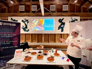 新年会では、東急ホテルのパティシエ・中山翔太様が焼き上げてくださった特別なガレットを頂きました。なんと、中山様ご本人にもお忙しい中会場までお越し頂き、この貴重な機会を参加者の皆様と一緒に楽しむことができました。中山様は2023年開催された第21回「ガレット・デ・ロワ コンテスト」にて見事優勝し、フランス大使館特別賞を受賞。さらに2024年のパリで開催された「ガレット・デ・ロワ コンクール」では、準グランプリに輝かれています。