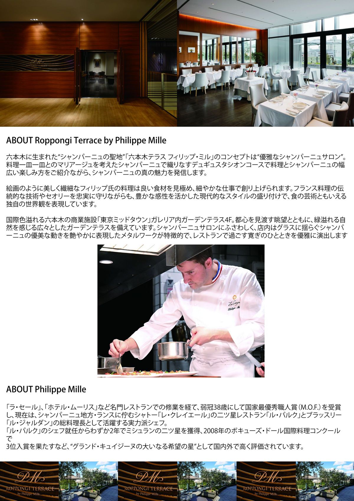 38歳にして国家最優秀職人賞(M.O.F)を受賞したフランス・シャンパーニュ地方でミシュラン二つ星に輝く「ドメーヌ レ・クレイエール」の総料理長フィリップ・ミル氏が日本にした初出店「六本木テラス フィリップ・ミル」は、「優雅なシャンパーニュサロン」がコンセプトのレストランで、上質なシャンパーニュにこだわり、大手有名メゾンからこだわりの小規模な作り手まで常時100銘柄以上のシャンパーニュを揃えている。