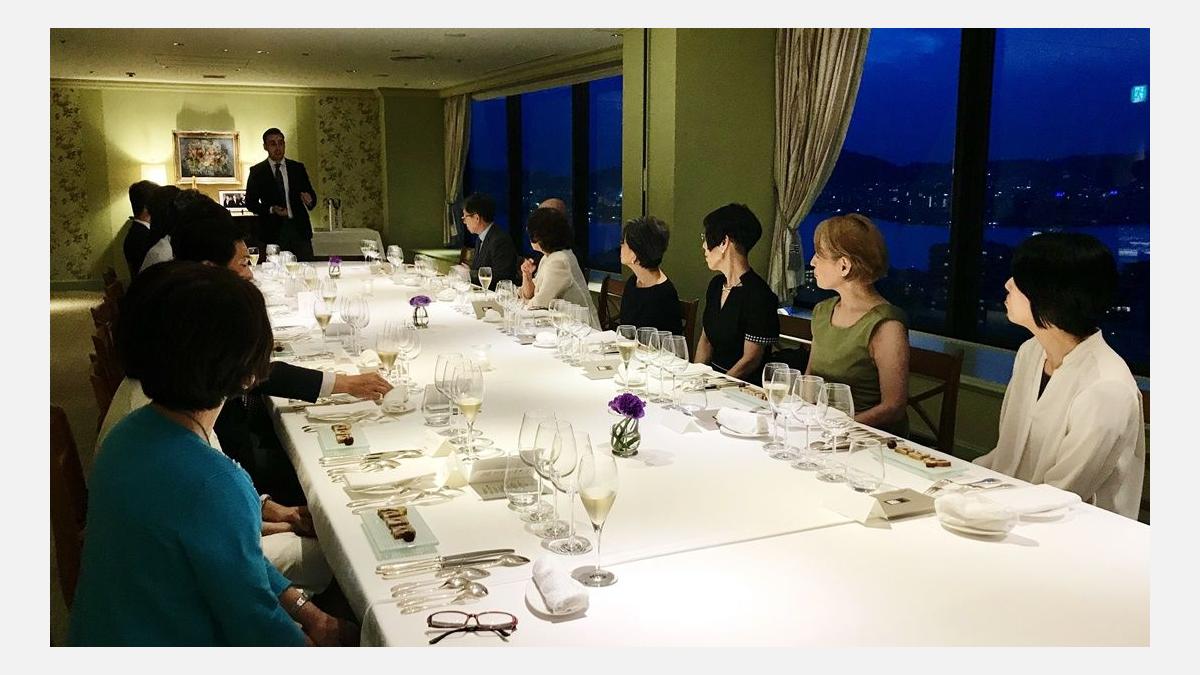 在日フランス商工会議所はこの晩餐会を開催していただいた株式会社ぐるなび、素晴らしいシャンパンを提供していただいたシャンパーニュ・テタンジェ、そしてシェフのマシュー・ヴィアネー氏、並びにレストラン「トランテアン」の皆様に心からお礼を申し上げます。