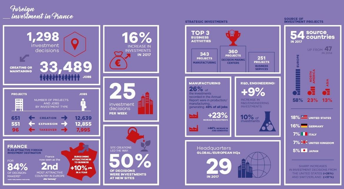 フランス貿易投資庁(ビジネスフランス)は2018年4月3日、2017年のフランスへの直接投資の結果をまとめた報告書を発表した。「フランス経済の国際化に関する報告書」によると、2017年の日本企業のフランスへの直接投資額は、中国と並んでアジア1位、全体で5位にランクインした。2017年、外国企業による対仏投資プロジェクトは1,298件にのぼり、前年比で16%増加した。