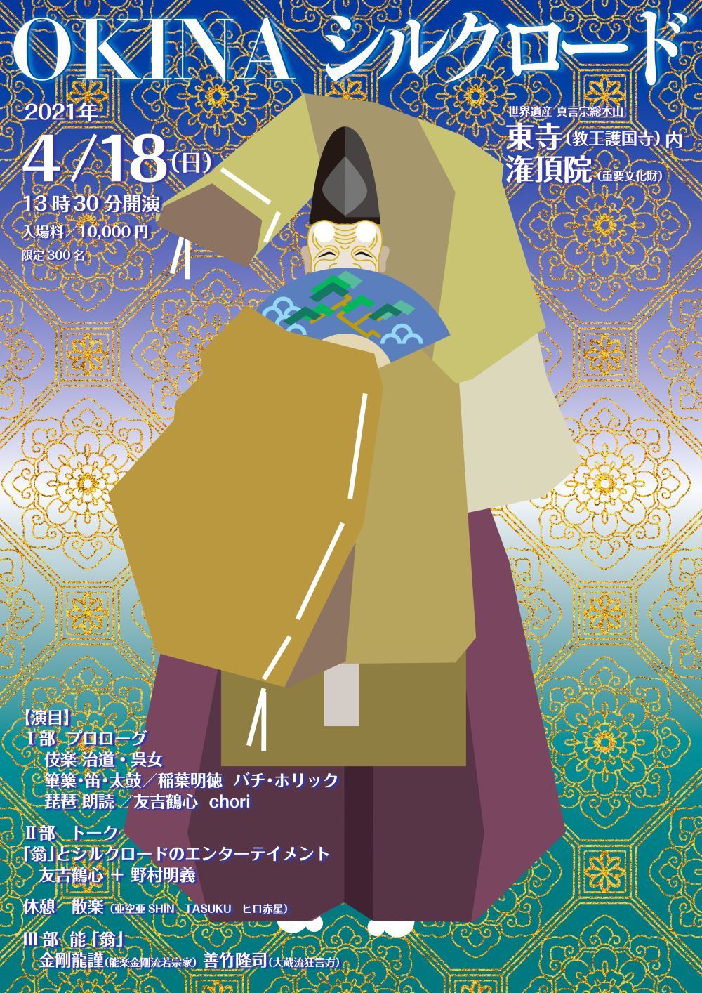 「〜東方より西方へ楽を奏でる〜 OKINAシルクロード」は、日本の「むかし」と「いま」の芸能を連れてシルクロードを西へ向かうことを目指す、「OKINAシルクロード企画」のキックオフイベントです。1200年あまり京都を見守ってきた東寺にて、室町時代より続く金剛流宗家による神能「翁」公演から、若手詩人のホープchoriによる詩の朗読まで、日本の「むかし」と「いま」が集うまたとない1日となることでしょう。