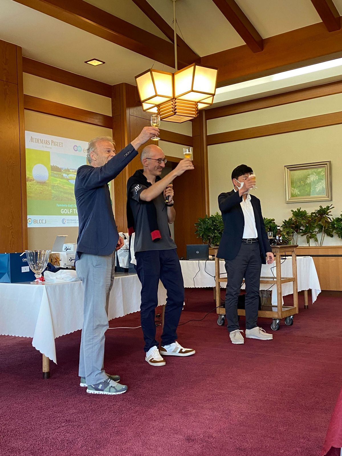 3つの商工会議所から集まったのは20チームほどで、参加者たちはゲストのフランス人プロゴルファー、セバスチャン・ギルマー氏によるチッピングやパッティングのアドバイスを受けながら、プレーと交流を楽しみました。トーナメントの終わりには全員が集まり、多くの豪華賞品が用意された表彰式を開催するとともに、ネットワーキングの時間を過ごしました。