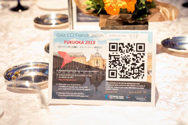 招待客はテーブルごとにチームになり、ボルドー、福岡そして在日フランス商工会議所に関するスペシャルクイズ(アジアンス・ジャパン企画)にチャレンジした。勝利したテーブルには、招待客ひとりひとりにボルドーワイン委員会提供のワインが贈られた。また、恒例の大抽選会では、エールフランス提供のパリ往復航空券つきフランス旅行の大賞など50点近くの豪華賞品が用意され、このイベントを締めくくった。