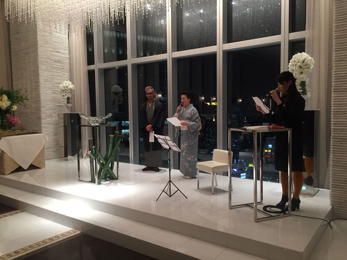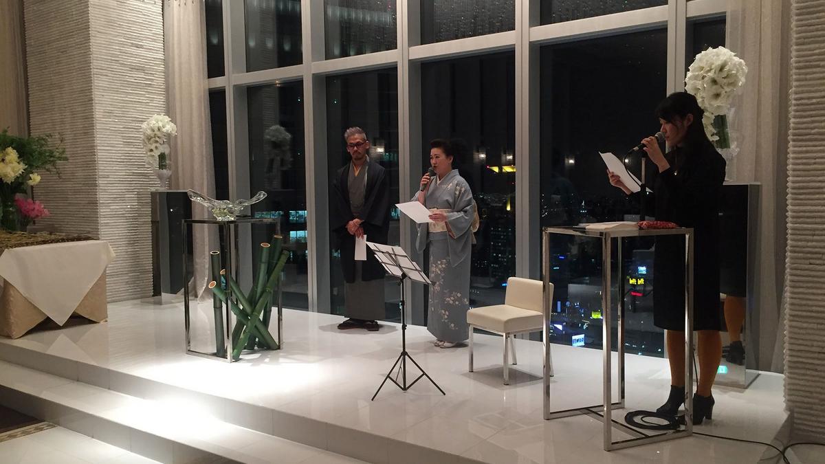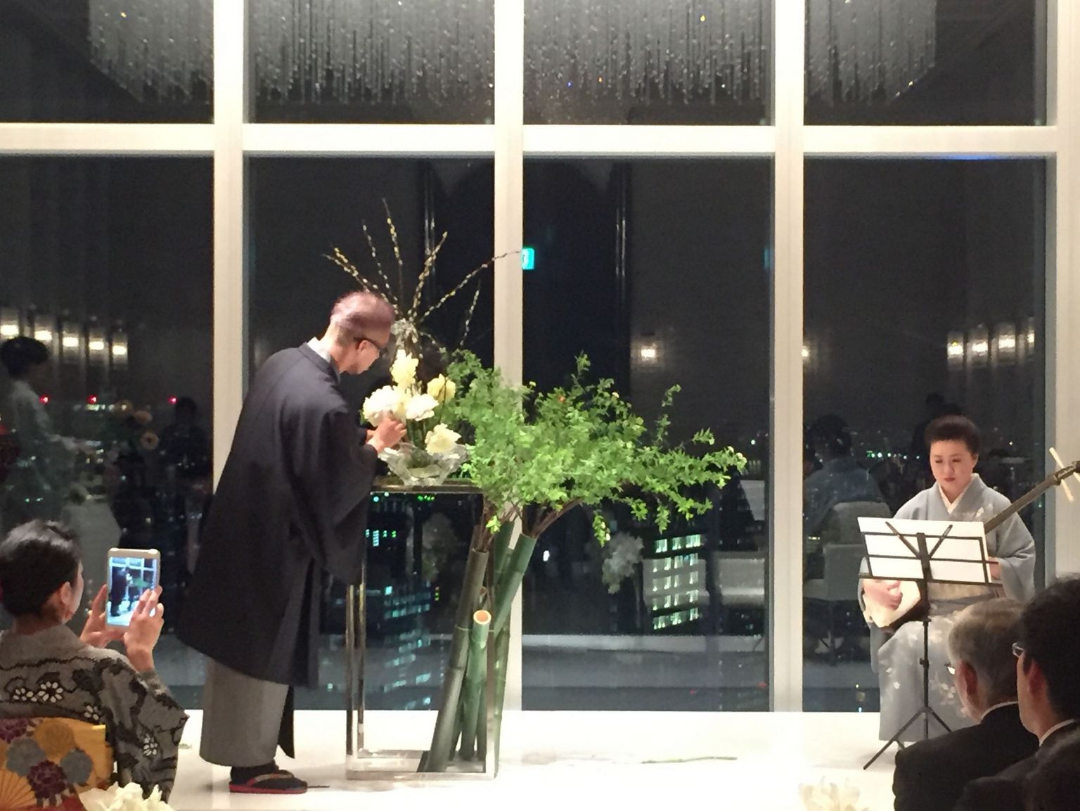 2017年1月30日(金)、在日フランス商工会議所関西デスクの2017年新年会が大阪のラグナヴェール プレミアで開催された。大阪の中心にあるラグナヴェール プレミアの荘厳なチャペルにて開催した同イベントでは、華道家の矢田青幸氏と長唄三味線今藤流の今藤和歌美氏という2人の日本人アーティストを招待し、三味線と生け花のコラボレーションによるパフォーマンスを披露。今藤氏の三味線の音色に合わせ、矢田氏の手により、研ぎ澄まされた感性でクリスタルの花瓶に華麗に紡ぎだされた生け花作品に、多くの参加者が魅了された。スポンサー企業提供のシャンパン「ルメール」で乾杯の後、当会場のシェフによるフランス料理がビュッフェスタイルで振る舞われた。和やかな雰囲気の中、参加者は今年のプロジェクトについて情報交換しつつ、思い思いにイベントを愉しんでいた。