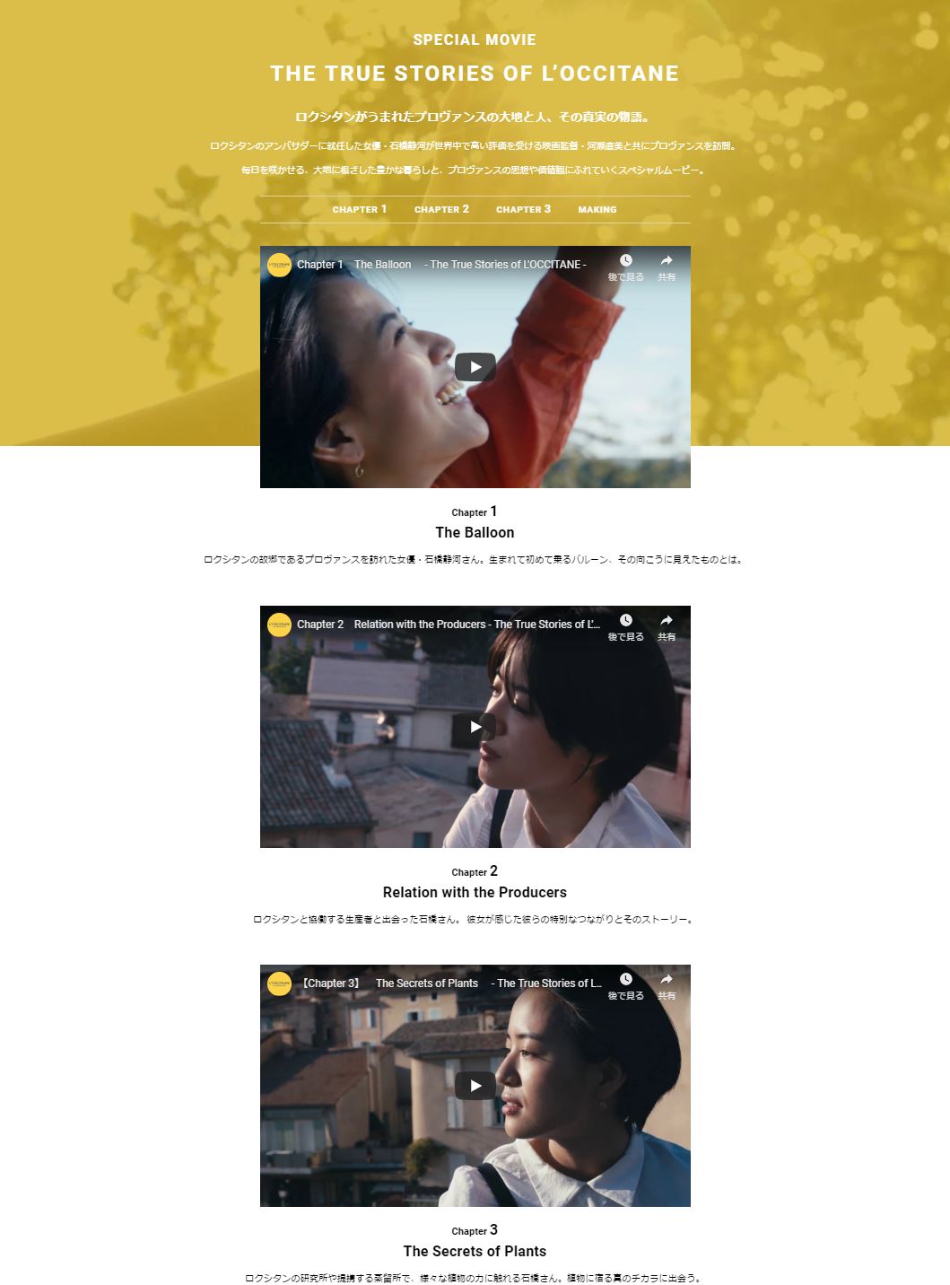 Celle-ci s’envole à bord d’un ballon pour admirer vu du ciel la Provence, terre d’origine de la marque lors du premier opus. Le second mets en avant la rencontre avec les collaborateurs et producteurs qui racontent la confiance tissée avec L’Occitane. Enfin, le dernier volet montre Shizuka au cœur du laboratoire pour une découvertes des ingrédients et des savoir-faire.