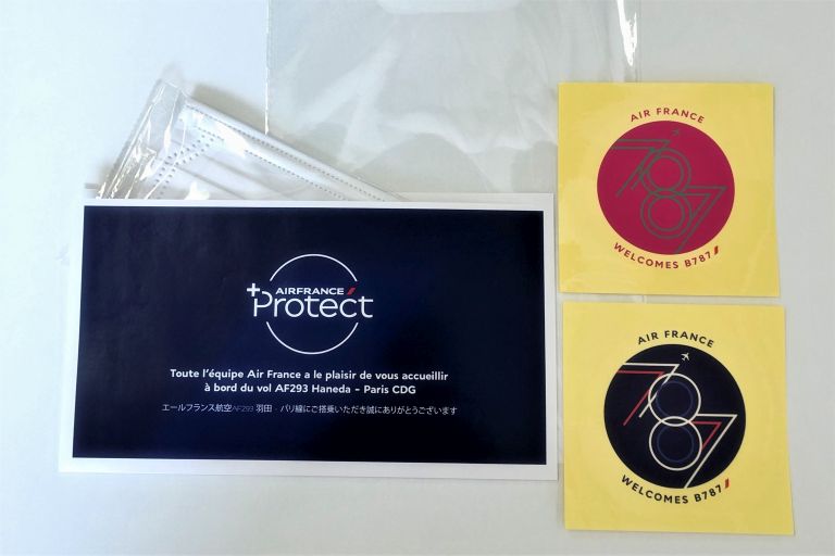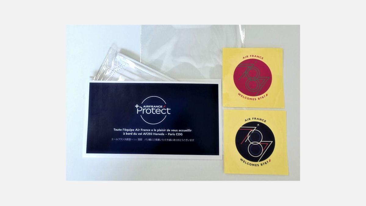 Passengers boarding the AF293 bound for Paris-Charles de Gaulle received a special welcome kit including a facemask envelope.