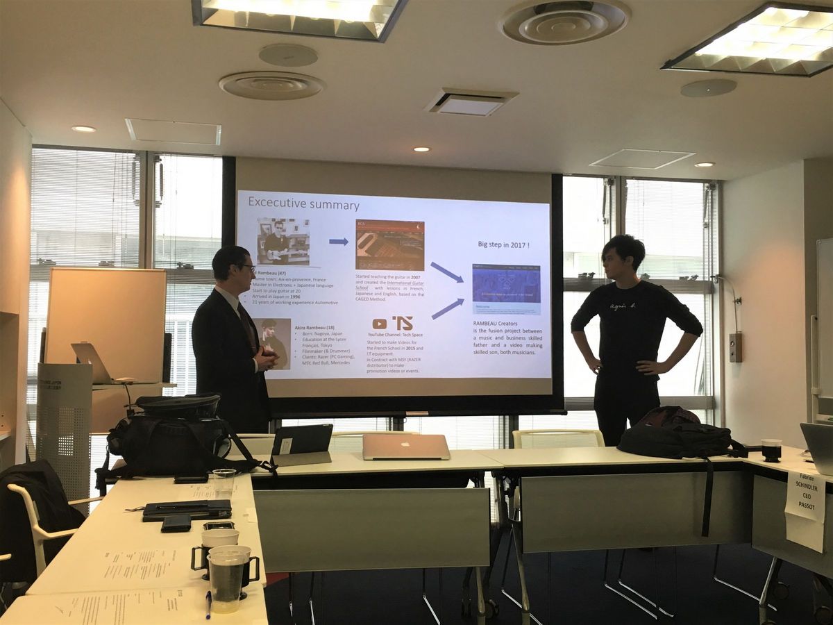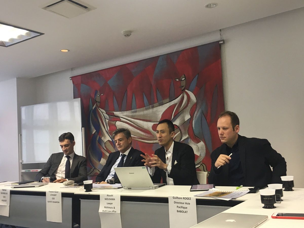 Lors de cette session, le jury était composé de cinq experts : Fabrice Schindler, fondateur et président de Passot, François-Xavier Lienhart, PDG de Buffet-Crampon Japon, Maître Atsushi Mizushima, avocat chez Nishimura&Asahi law office, Guilhem Rogez, directeur Asie-Pacifique chez Babolat Japan et Laurent Swinnen, PDG de Sigmaphi Japan. Ce panel dynamique et varié a pu partager son expérience avec les 3 porteurs de projet, exposant tour à tour leurs innovations musicales, technologiques et sportives.