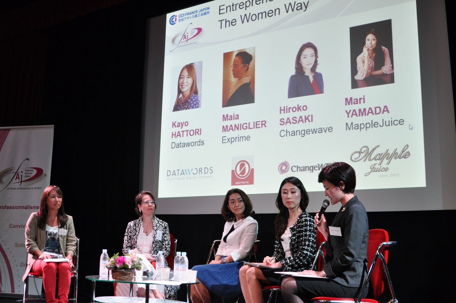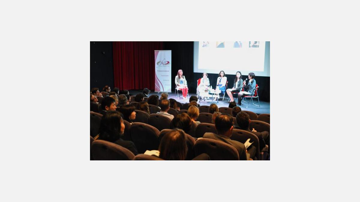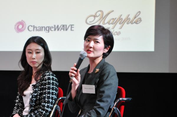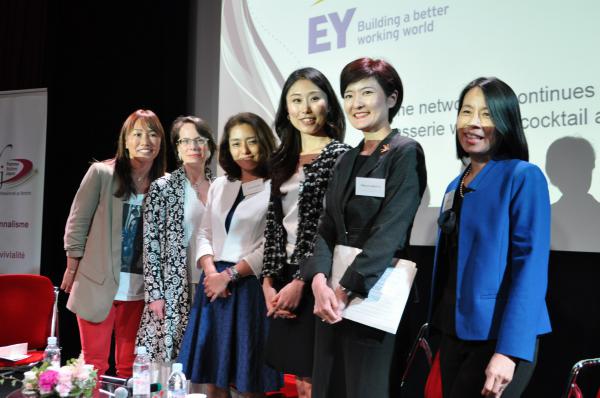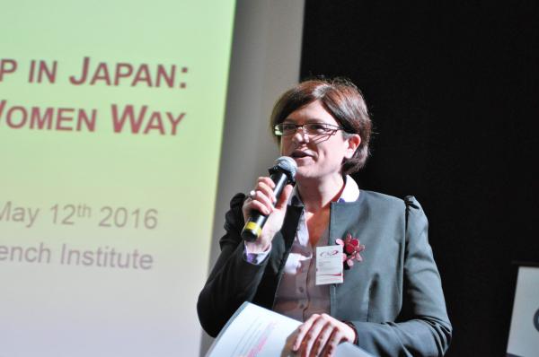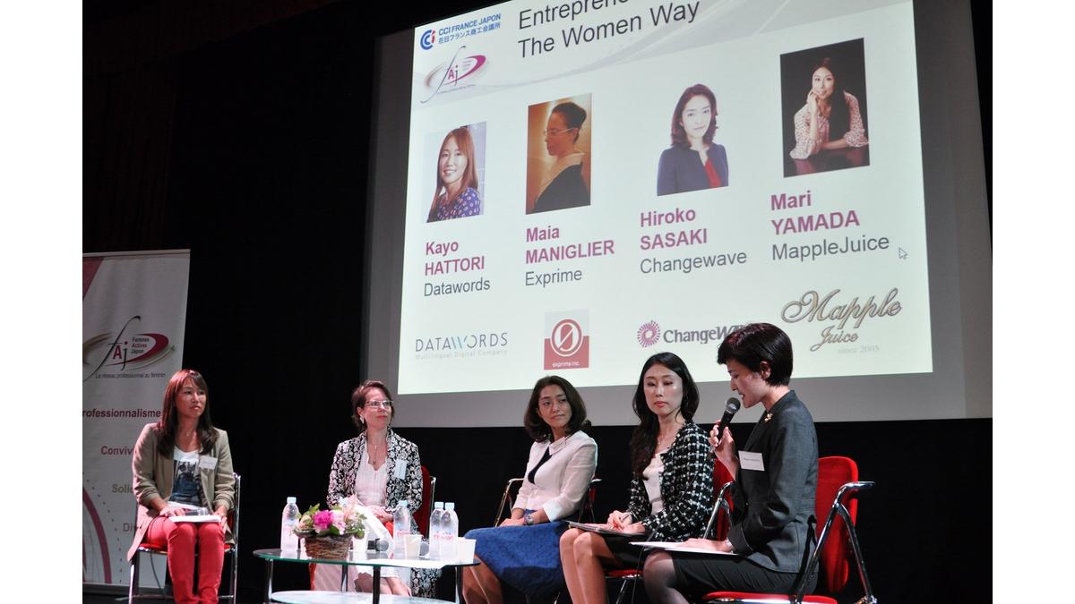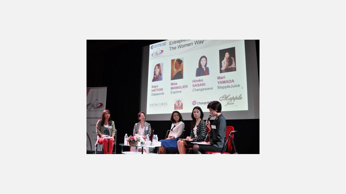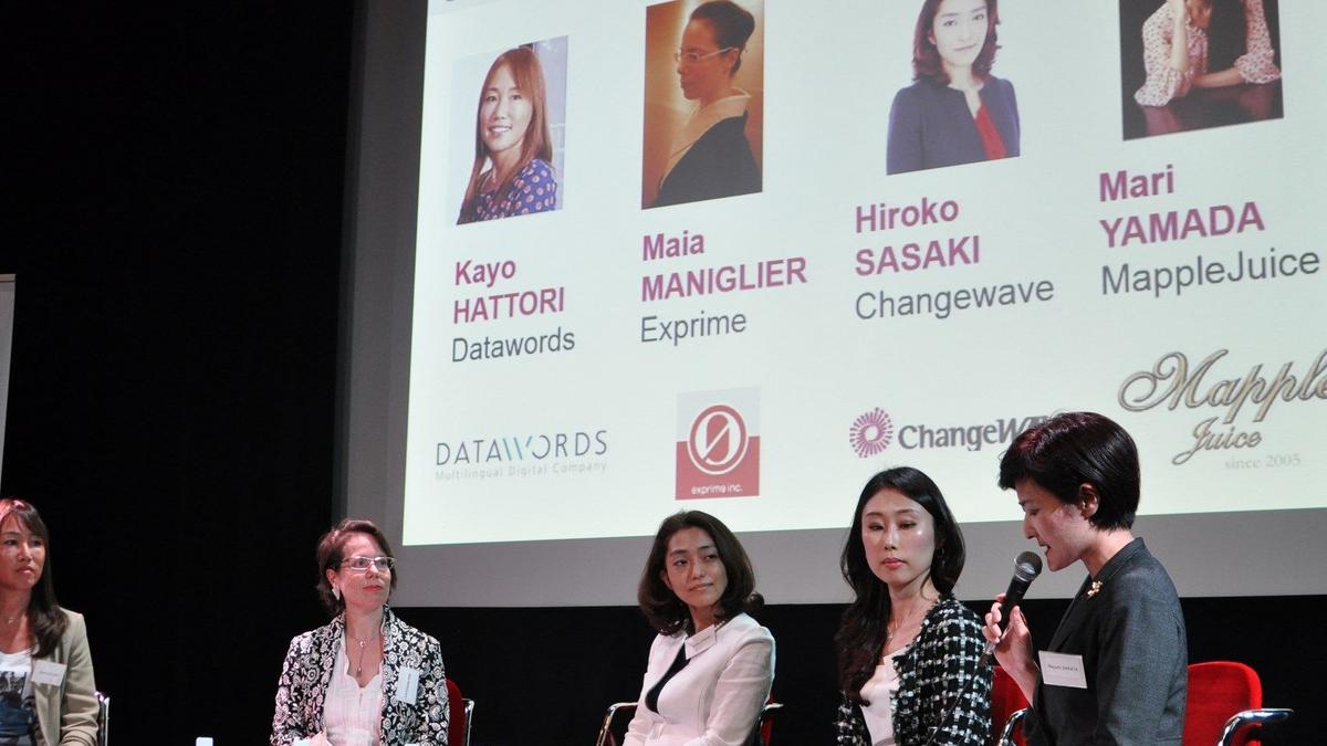chez Valeo, en charge du réseau “Valeo connected women” au Japon. Le panel était composé de 4 entrepreneures : Kayo Hattori, de Datawords, Maïa Maniglier, d’Exprime, Hiroko Sasaki, de Changewave, et Mari Yamada, de Mapple Juice. Sur les difficultés particulières aux femmes, les intervenantes ont souligné le poids des traditions et des clichés sexistes qui, au sein des grandes entreprises, privent souvent les femmes de postes à responsabilité. La maternité est aussi fréquemment un obstacle en raison du manque d’infrastructures d’accueil des jeunes enfants. Toutes ont néanmoins reconnu qu’être de sexe féminin pouvait permettre de suggérer des idées innovantes, ou de mettre en avant une sensibilité particulière dans des postes de conseil, sans craindre de froisser les egos masculins.