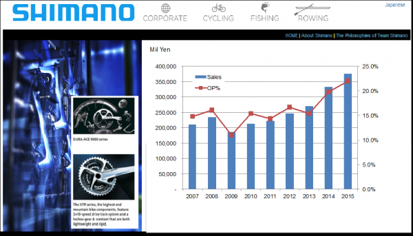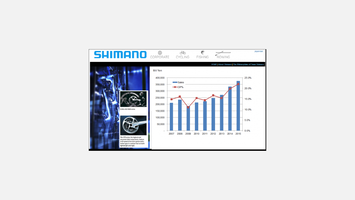 Shimano always sticks to end-user interface in terms of research, communication and services. Good example was dealer caravans that lasted 3 years to visit all the 6000 dealers in the US by 4000cc station wagons filled with new products, parts, tools etc to provide after-sales services, handle claims, support repairs, collect information and introduce new products. The Japanese bicycle parts company recruit bicycle manias or retired professional cyclists for product development. Commuting by bike is encouraged and 24-hour service jacuzzi is installed in the headquarters. Needless to say financial performances are excellent.