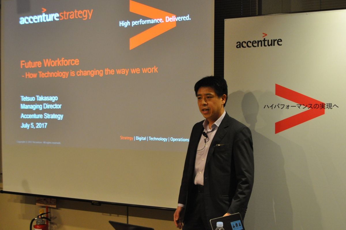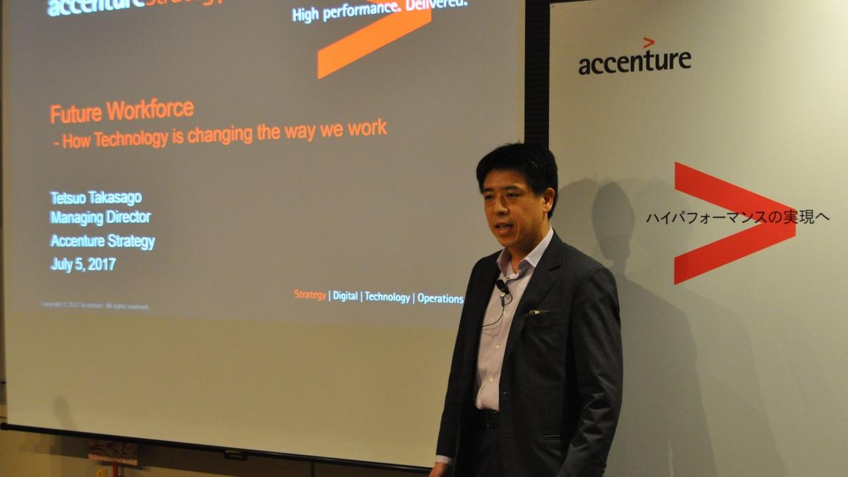 Tetsuo Takasago, Managing Director à Accenture Strategy et expert de l'impact qu’a la technologie sur les business models et les domaines d'activités des entreprises, a donné une conférence sur le « travail du futur » avec en ligne de mire l’introduction des services RPA (Robotic Process Automation) et de l’IA (Intelligence Artificielle) en entreprise, et leur impact sur nos habitudes de travail.