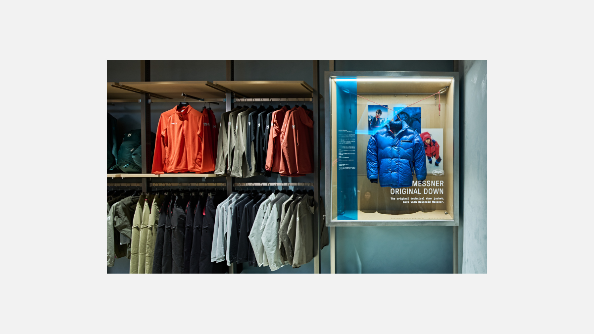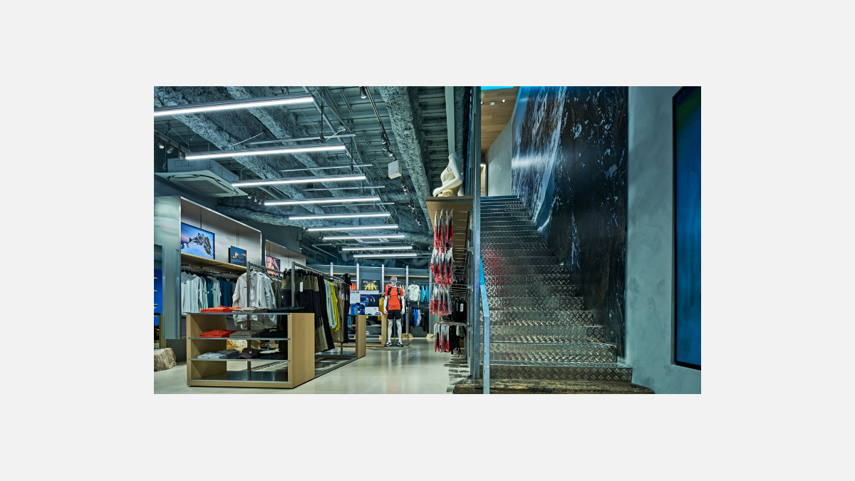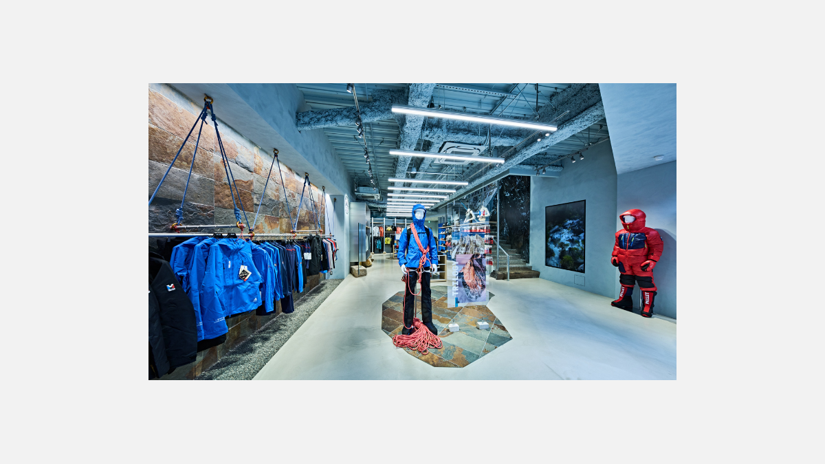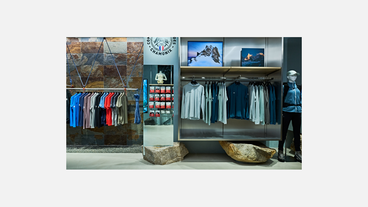 Le premier étage du magasin s’inspire des crêtes rocheuses de Chamonix, berceau historique de la marque. L’espace a été pensé non seulement comme une boutique, mais aussi comme un lieu de rencontre pour la communauté outdoor. On y trouve notamment des livres et photographies consacrés à l’alpinisme et à la culture de la montagne.