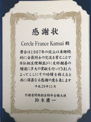 Pour couronner ce 20ème anniversaire, un certificat émis par le ministère des affaires étrangères du Japon a été remis en décembre par Yoichi Suzuki afin de saluer les activités menées depuis 20 ans qui permettent de développer et consolider l'amitié Franco-Japonaise.