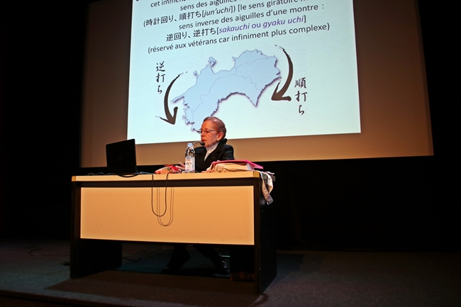 Afin de mieux comprendre les tenants et aboutissants de ce pèlerinage, Muriel Jolivet a commencé par présenter l’île assez méconnue qu’est le Shikoku, ainsi que le bouddhisme ésotérique Shingon qui est à l’origine du pèlerinage. Si ce dernier attire un nombre important de pèlerins chaque année, la complexité du parcours requiert un minimum de préparation, d’autant plus que les aptitudes physiques et les limites des pèlerins différent autant que leurs objectifs. A pied le tour complet de l’île prend entre 40 et 50 jours, mais les pèlerins ont la possibilité d’emprunter quelques moyens de locomotion comme le train, le bus ou la voiture qui ne les dispensera pas pour autant de longues marches et de montées. Pour Mme Jolivet, peu importe le moyen, l’essentiel est le voyage spirituel qui est entrepris, que le pèlerin soit croyant ou athée.