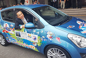 Les véhicules électriques fournis sont des véhicules ordinaires convertis, équipés du système « New In-wheel Motor System », plus compact et léger que le modelé conventionnel. 3 ont été offerts à la Préfecture de Mie et 2 à la ville de Kuwana. Ils seront utilisés comme véhicules officiels par les membres de l’équipe organisatrice.