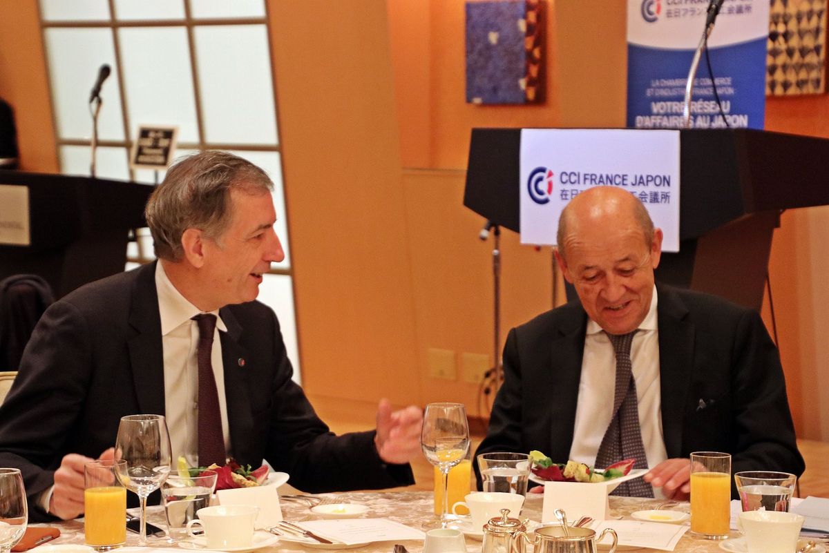 Lors du déjeuner en présence de la communauté d’affaire franco-japonaise, Jean-Yves Le Drian a souligné l’importance de l’année 2018 pour la France et le Japon entre les 160 ans des relations diplomatiques entre les deux pays et le Centenaire de la CCI France Japon qu’il a chaleureusement félicité.