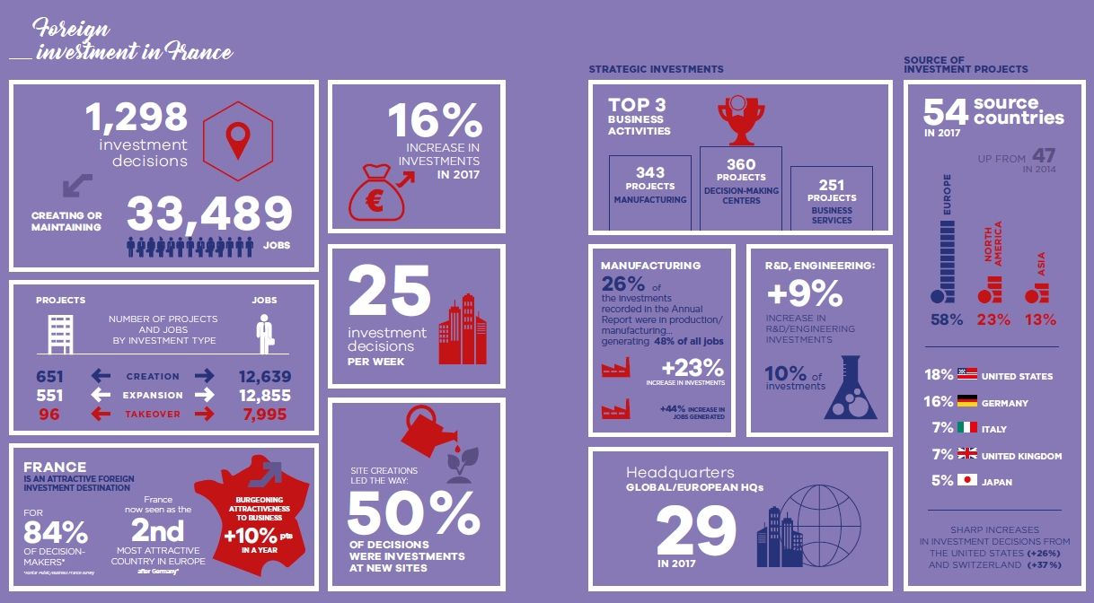 L’année 2017 a bénéficié d’une confiance renouvelée et affirmée des investisseurs étrangers, qui par leurs décisions d’investissement reconnaissent le potentiel français, et soulignent les forces françaises sur des segments générateurs d’emplois et à forte valeur ajoutée.