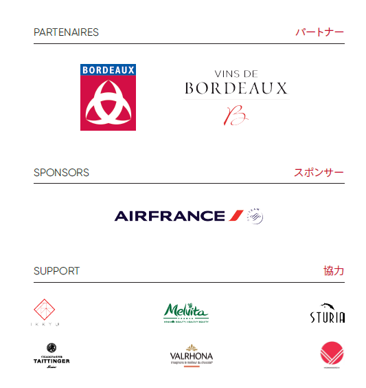 La CCI France Japon remercie la ville de Bordeaux, le Conseil Interprofessionnel du Vin de Bordeaux (CIVB) pour les vins et les entreprises donatrices pour les lots offerts lors de la tombola ainsi que les sponsors et partenaires qui ont rendu cet événement possible :