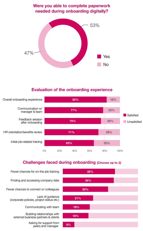 More than 50% of new hires undergo onboarding remotely. 82% of job changers satisfied with the overall onboarding experience during Covid-19