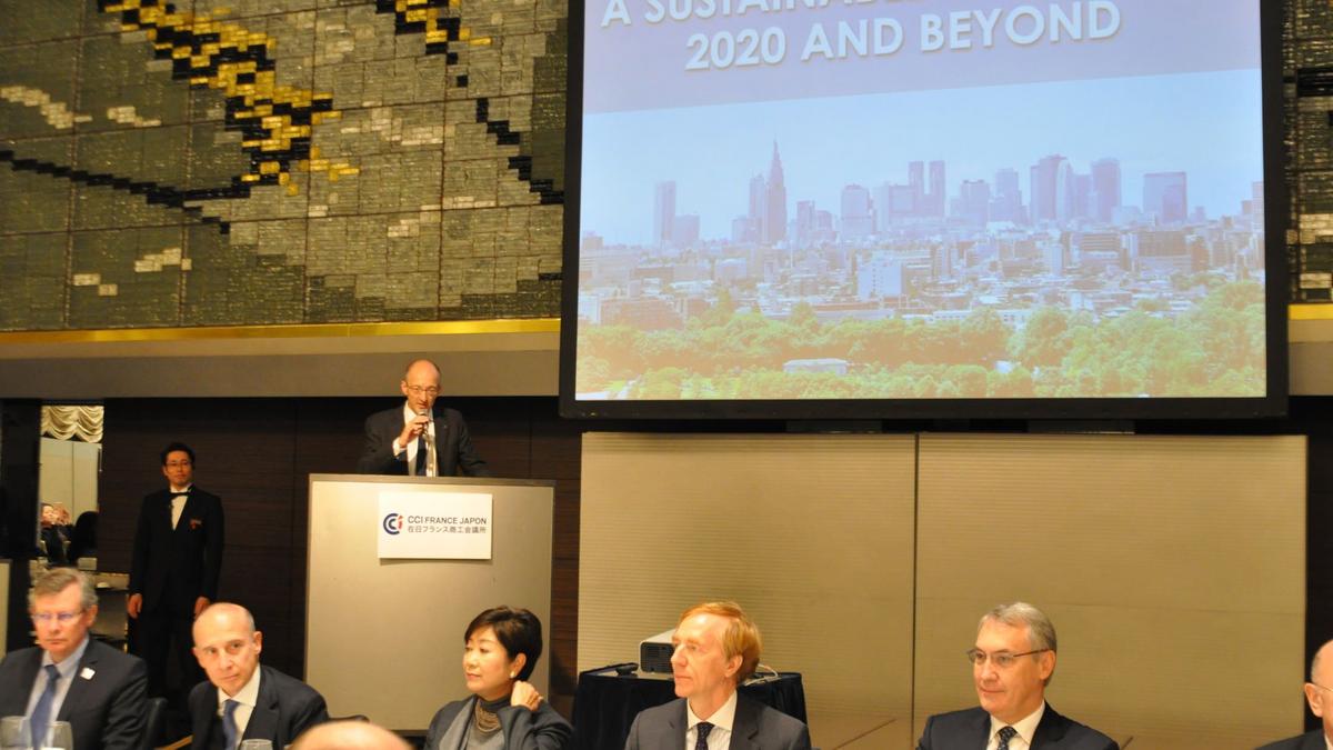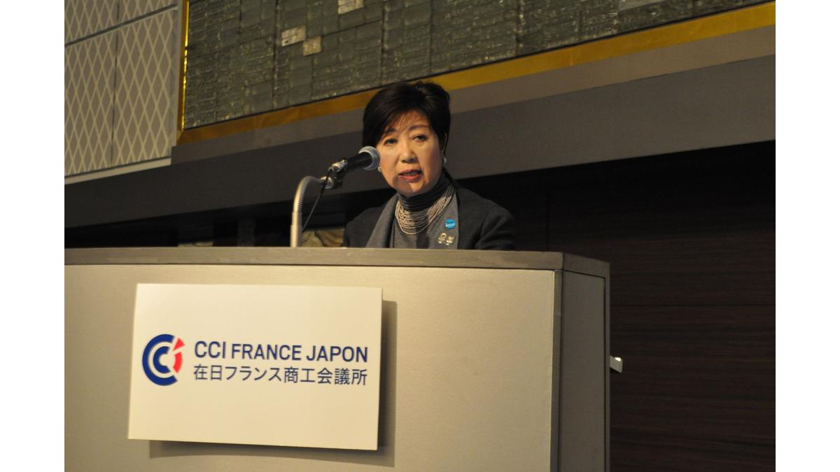 After an opening speech by Philippe Avril, Board Member of the French Chamber, the Tokyo governor went up on stage. Yuriko Koike spoke on some of the initiatives the Tokyo Metropolitan Government is engaged in to develop Tokyo into a more sustainable city, the objective being to create a “New Tokyo” that is three cities in one: