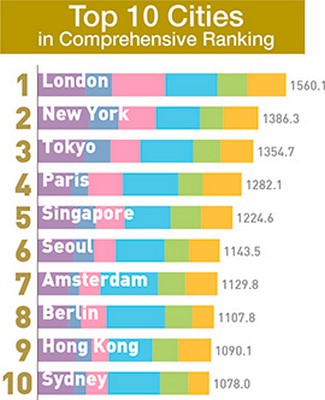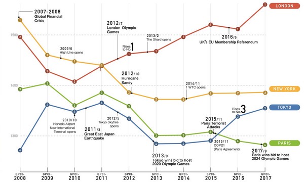 Pour la seconde année consécutive, Tokyo se classe 3ème, derrière Londres (1er) et New-York (2nd), qu’elle talonne de peu. La ville américaine a en effet affiché une stagnation alors que Tokyo ne cesse de progresser, notamment avec un accroissement du nombre de visiteurs étrangers et du nombre d’étudiants internationaux.