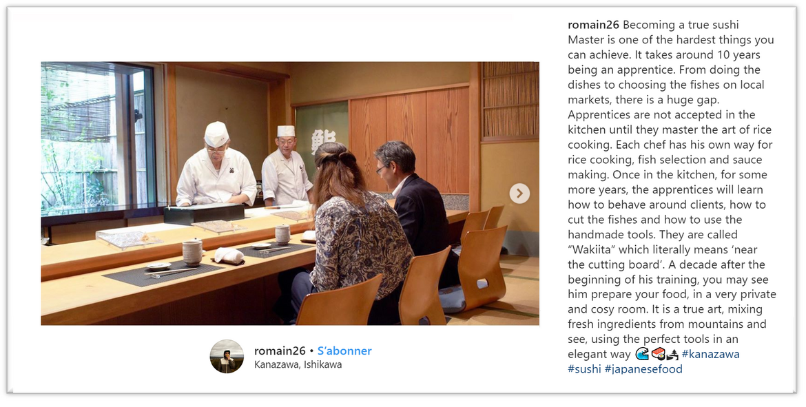 Sur le chemin du château, en plein centre-ville, on trouve le marché Omi-cho de poissons frais. Les couleurs sont sublimes, l'odeur nous laisse rêveurs, et finalement on découvre ce qu'est vraiment un poisson frais. Les restaurateurs les plus doués de Kanazawa viennent chercher leurs produits dans ce marché ouvert depuis des siècles. Les maîtres sushis ne prennent que le meilleur. Ils associent aux poissons des produits frais venant de la montagne. Leurs oeuvres représentent bien Kanazawa, divine entre mer et montagnes. Et "oeuvre" est le terme correct, voire "chef d'oeuvre", quand on connaît le chemin que doit parcourir quelqu'un pour devenir maître sushi.