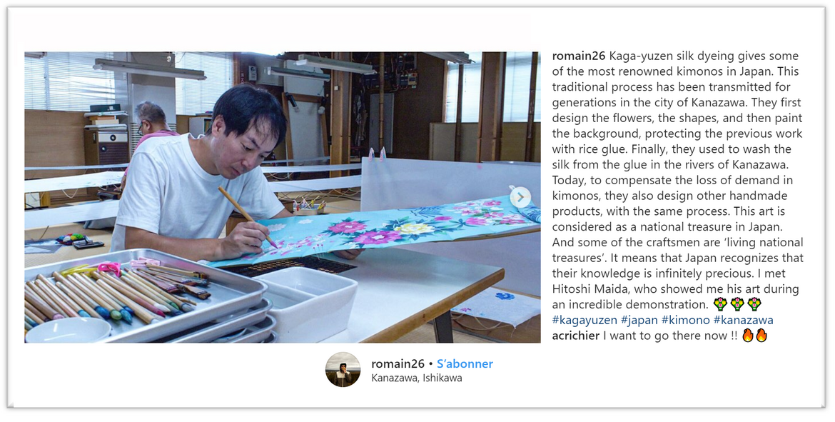 Kanazawa garde ses traditions intactes. Dans les vieux bâtiments, on trouve des objets fabriqués à la main, couverts de feuilles d'or. Au détour des ruelles anciennes, on croise parfois des Japonais qui semblent venus d'un autre temps. Couverts de tissu, seuls les plus aisés portent des Kaga-yuzen. Cette technique de coloration, encore utilisée aujourd'hui, on peut la découvrir et même l'essayer.